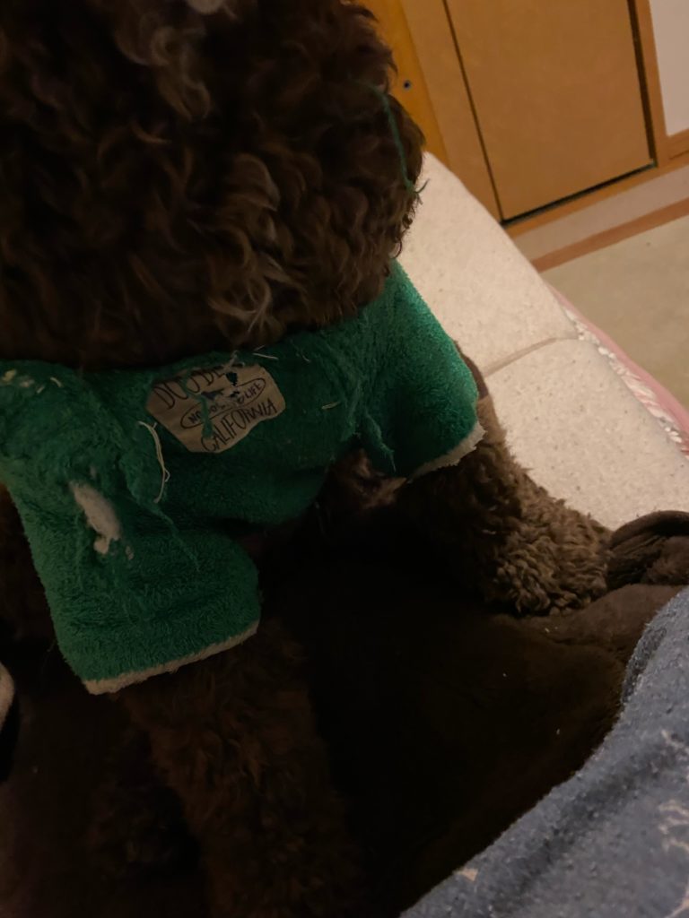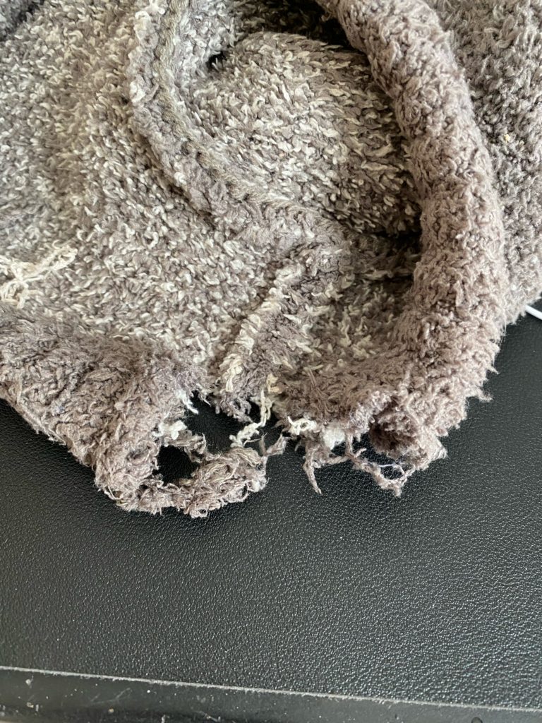 人間の赤ちゃんと一緒で(まだ1歳だから?)、よる寝る前は不安がよぎるのか・・泣くわけではないのですが、おとーさんに甘噛みしたり、フンフン鼻をならしたり、特に最近は洋服に八つ当たりします。そして首回りがボロボロに・・( ;∀;)